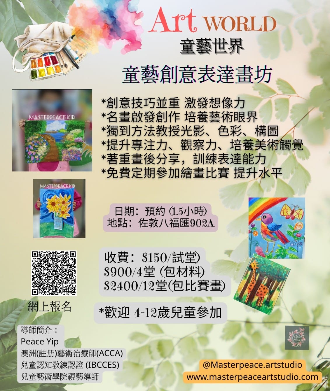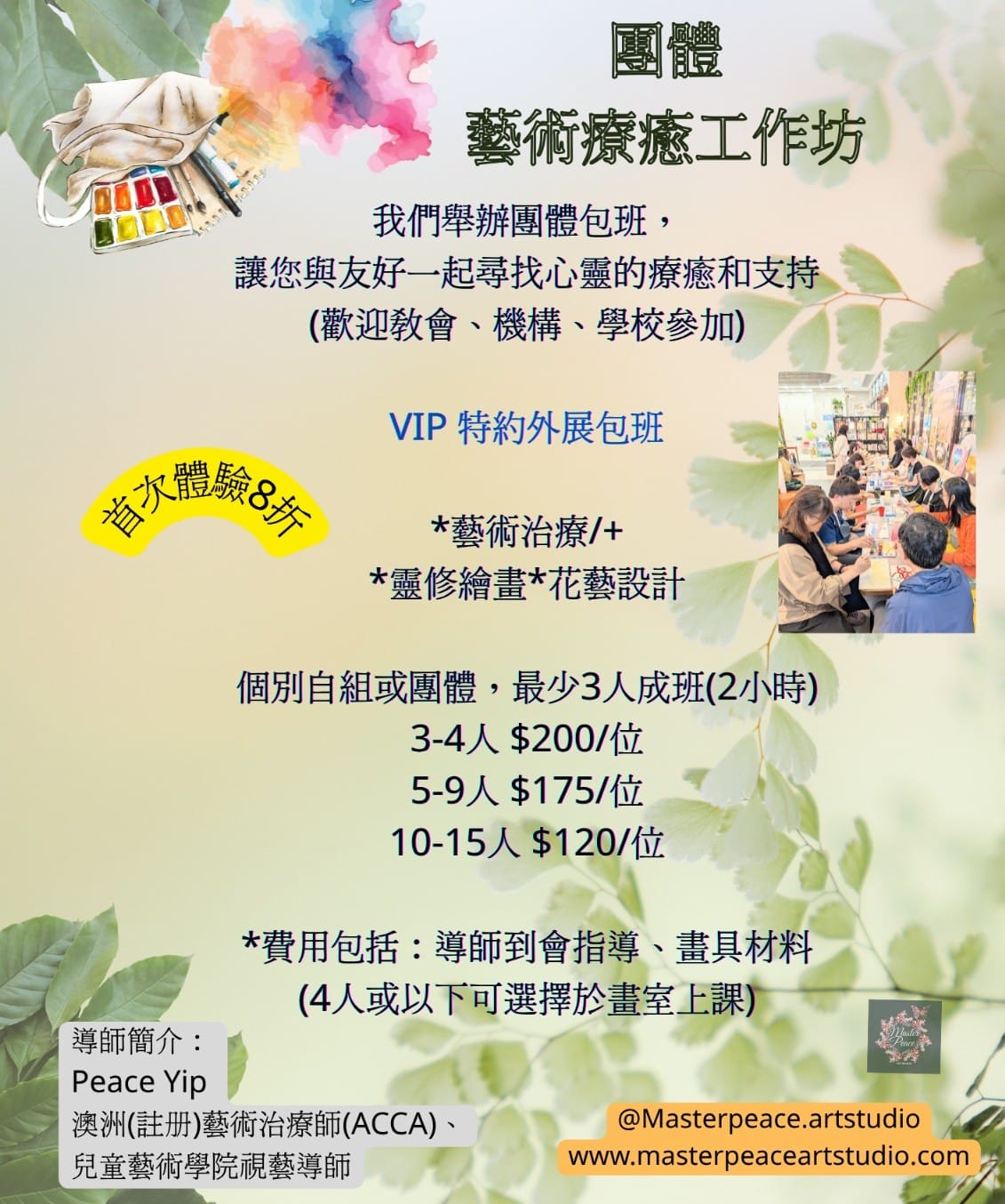 簡介 : MasterPeace Artstudio 是一間藝術療癒畫室,我們透過藝術治療、正向心理學、靈修繪畫幫助客人在藝創作中釋放壓力,療癒心情!我們也提供花藝與繪畫技巧訓練,提升學員藝術造藝