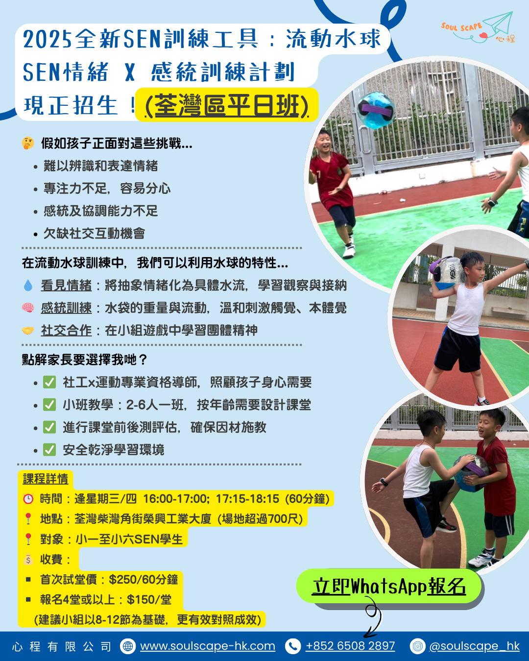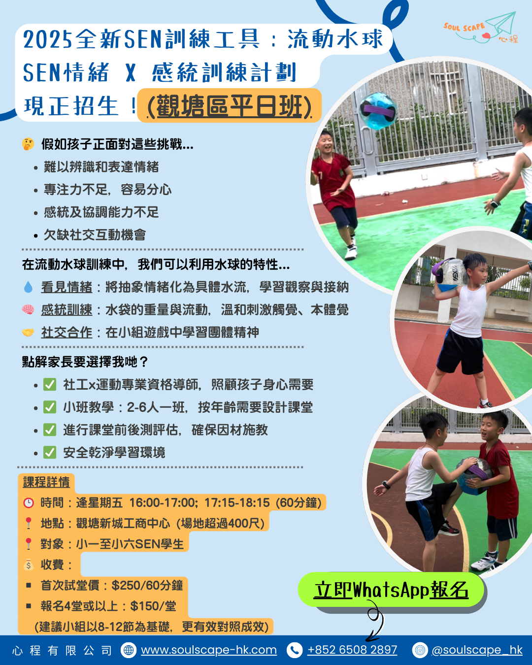 我哋引入全港首創嘅「流動水球」訓練,唔係普通波波咁簡單!我哋巧妙地運用「水」嘅流動特性,幫助SEN孩子: